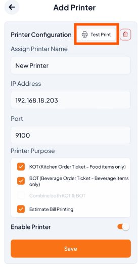 On the printer setup screen, tap the Test Print button at the top.