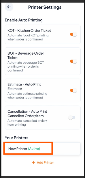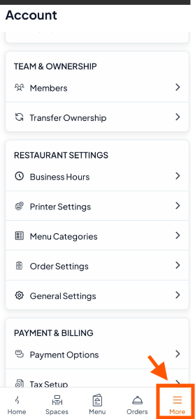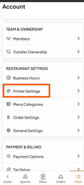 Step 2: Scroll to Restaurant Settings and tap "Printer Settings".