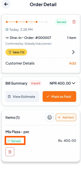 After serving the food, mark the order as Served to complete it and keep table/room status accurate.