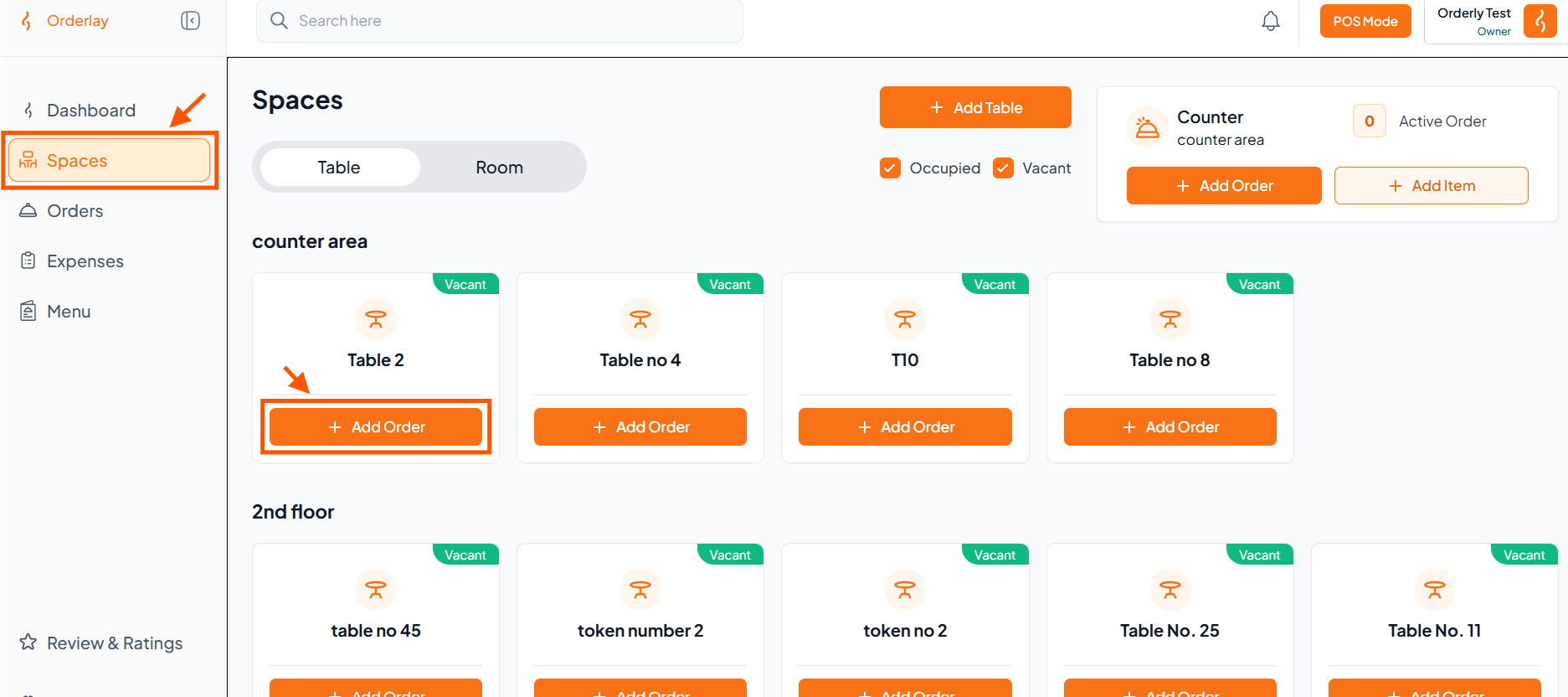 Tap Spaces to open the Tables & Rooms.