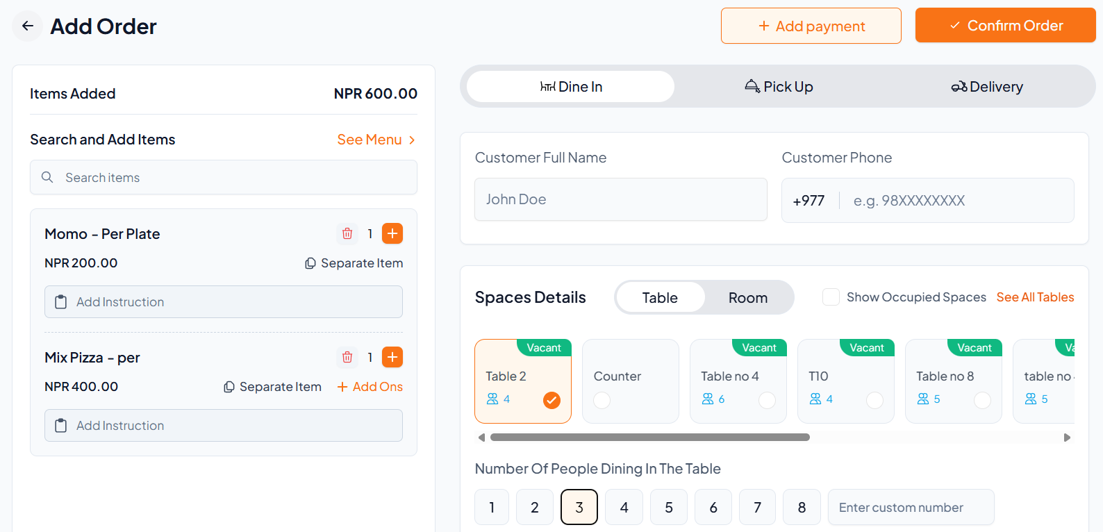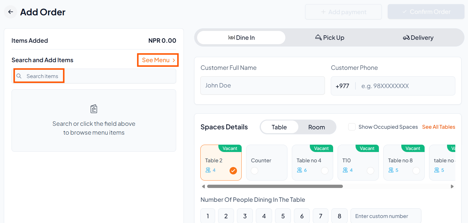 Select a Vacant table or room (e.g., Table 2)