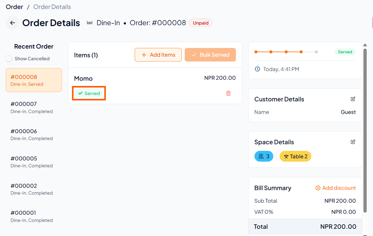 After serving the food, mark the order as Served to complete it and keep table/room status accurate.