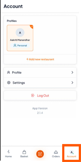 Open the Orderlay app and tap on the "Account" icon at the bottom right of your screen.