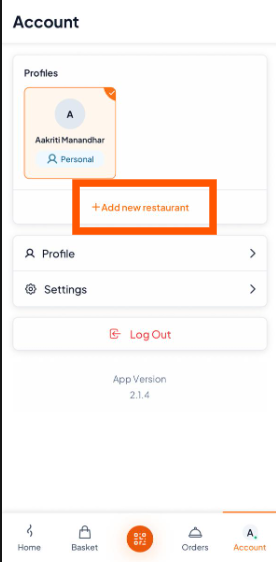 Tap the "+ Add new restaurant" button on your Account page.