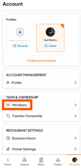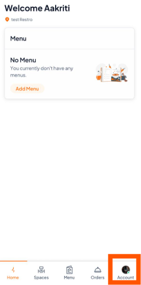 First, make sure you are switched into your restaurant account (e.g., Test Restro), not your personal account then Tap on the "Account" at the bottom right of your screen.