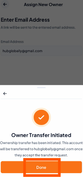 A confirmation message will appear "Owner Transfer Initiated". Click "Done" to confirm.