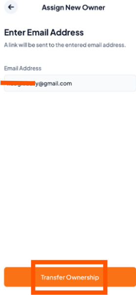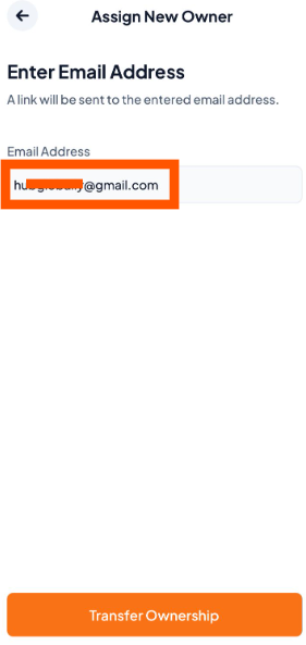 Enter the new owner’s email address or phone number. For example: In our case, the new owner's account was created with email, so we enter the same email to transfer ownership.
