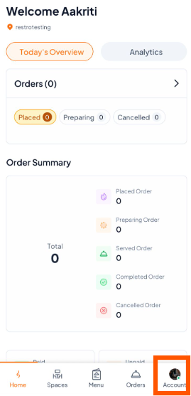 Open the Orderlay app, switch to your restaurant account (e.g.,Test Restro), and tap the "Account" icon at the bottom right.