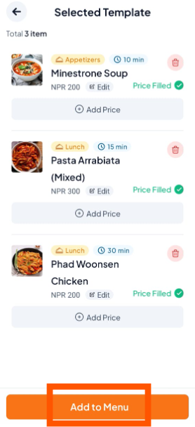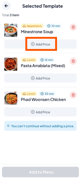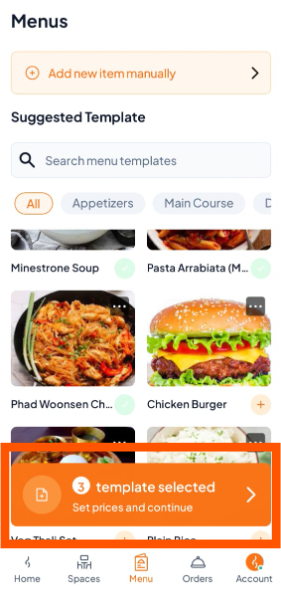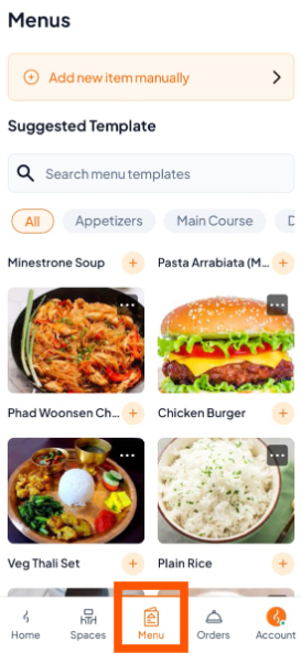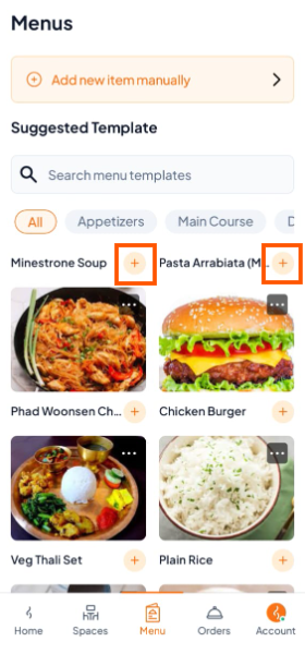 On the Menus page, you'll see a Suggested Template with items like Minestrone Soup, Pasta Arrabiata, and Chicken Burger. To add any of these to your menu, simply click the (+) sign next to each item you want to include.