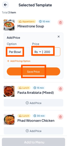 To add a price for the item, first enter the option (for example, Per Bowl, Per Plate) and then enter the price (for example, Rs 200). If the item has multiple price or option, you can tap + Add Pricing Option to include them. Once all details are entered, tap "Save Price" to confirm.