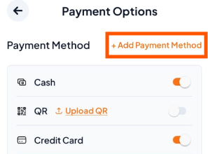 To add a new payment method: Tap "+ Add Payment Method" and follow the steps shown.