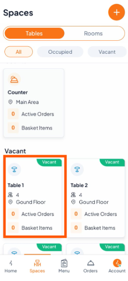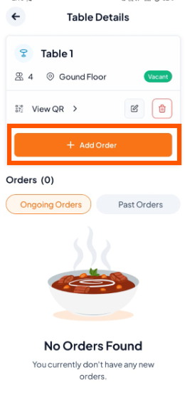 On the Table/Room Details screen, tap "+ Add Order" to open the menu.