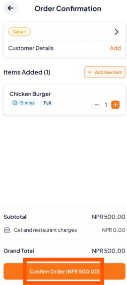 Check the order summary, subtotal and grand total. Tap "Confirm Order" to send it to the kitchen.
