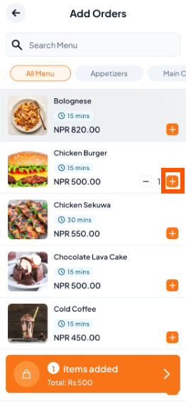 Browse or search the menu and tap (+) to add items (e.g., Chicken Burger). The order summary will update automatically at the bottom.