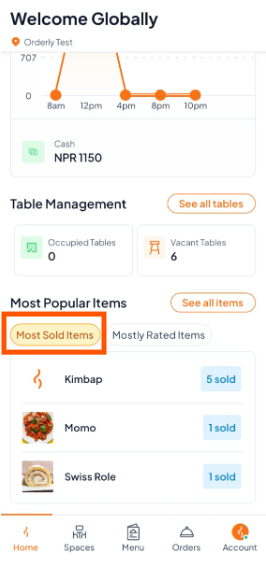 Look at the "Most Sold Items" list to see which dishes are ordered the most.