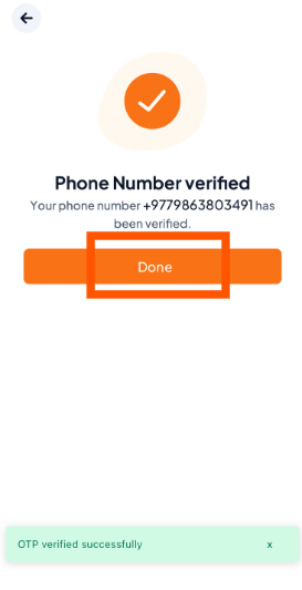 Once you click "Continue", a message will OTP verified successfully. Just tap "Done" to finish.