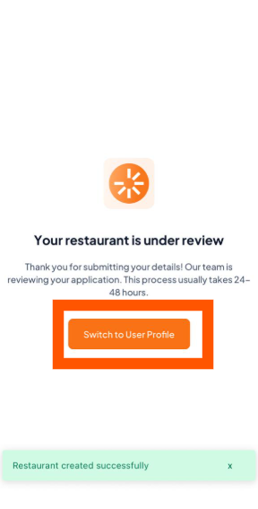 After you click "Proceed to Review" in the [Create Your Restaurant Profile] guide, your restaurant details will be sent to the Orderlay team for approval. Tap the "Switch to User Profile" button to go back to using the app as a customer.