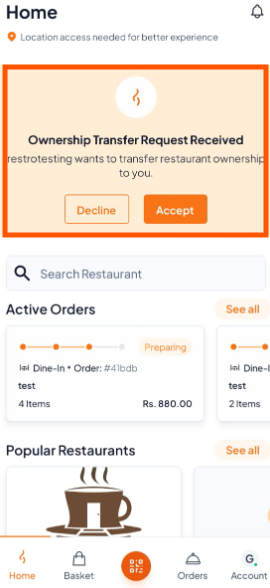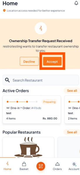 You have successfully transferred the ownership of your restaurant account in Orderlay.