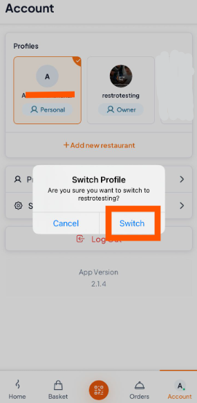 After accepting, go to the Account section where you will see the restaurant account listed; Tap on it to "Switch" from your personal account.