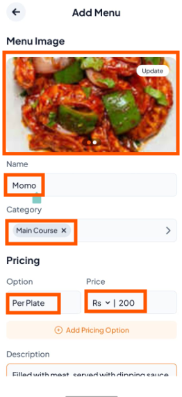 Properly categorizing items (e.g., Appetizers, Main Course) helps customers navigate your menu easily.