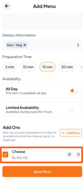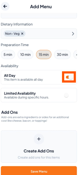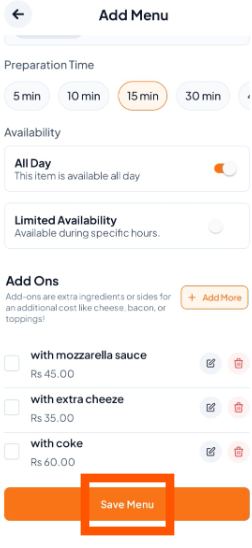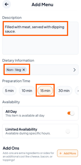 Preparation Time: Set the expected time (e.g., 5 min, 10 min) to manage customer expectations.