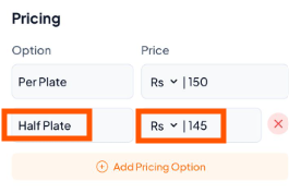 A new row will appear. In this new row: Enter the name of the option (e.g., "Half Plate") and price field, type the amount (e.g., 80).