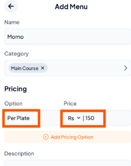 After entering your item's name and category, scroll down to the "Pricing" section on the "Add Menu" screen. You will see a table with columns for "Option" and "Price".