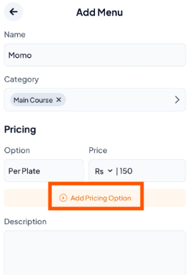 If your dish comes in different sizes, like a half plate or a full plate, you can easily add these choices. Just click the "Add Pricing Option" button.