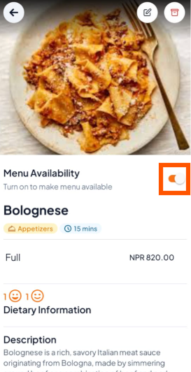 Go to the Menu section and Tap on any item you want to edit or delete (e.g., Bolognese).
