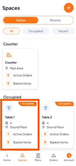 In Spaces, find and tap the occupied table or room (e.g., Table 1) you want to mark as vacant.