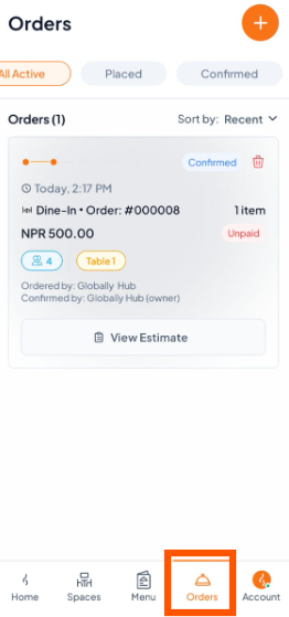 After confirming an order, navigate to the "Orders" tab from the bottom menu. Here, you will see a list of all active orders and their current status (e.g., Preparing, Ready).