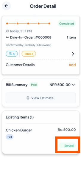 From the "Orders" tab, find and open the specific order. Inside the order details, tap the "Mark as Served" button.