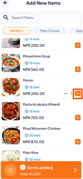 Browse and tap the (+) button to add any new items (e.g., "Momo").