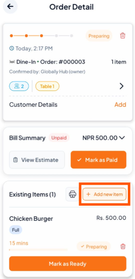 In the Order Detail screen, tap "+ Add new item" under Existing Items.