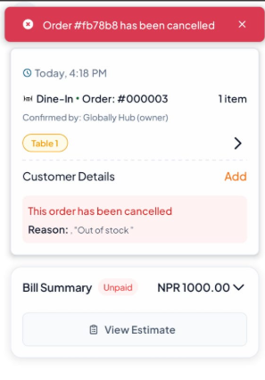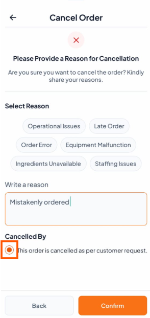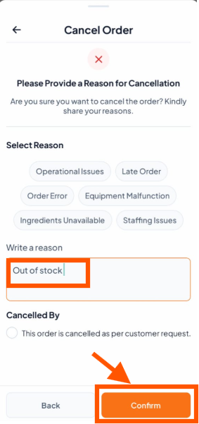 Select a Reason: You can quickly tap on a common reason listed under Select Reason or Write Your Own (For example, "Out of stock") and Click On "Conform".