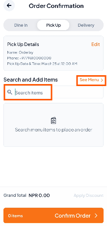 Step 4: Tap "Search Items" or "See Menu" to add items.