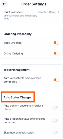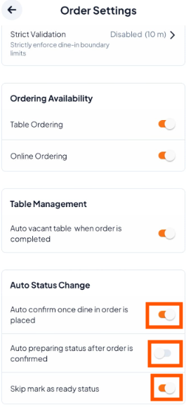 Auto Preparing: Moves orders from "Confirmed" → "Preparing" automatically.